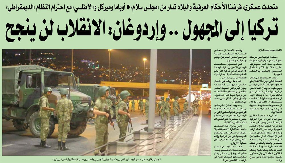 صحيفة الشرق الاوسط تركيا إلى المجهول .. وإردوغان: الانقلاب لن ينجح